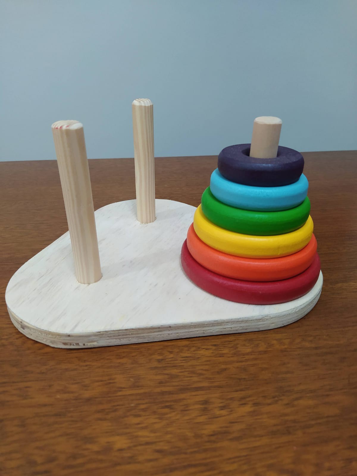 A Torre de Hanoi possui uma base com três pinos e seis peças coloridas em tamanhos diferentes. A brincadeira consiste em mudar as peças de lugar sem nunca deixar uma peça de tamanho maior por cima das menores, desenvolvendo o raciocínio da criança.